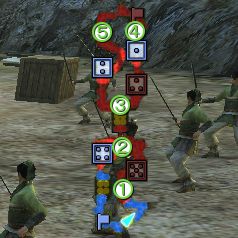 <1>①虚・馬超(SA)、②、虚・張飛(HA)③虚・趙雲(SA)、④虚・黄忠(SA)、⑤虚・関羽(HA)を撃破する。 <2>クリアした時間が早ければ達成度S。 <*>兵糧庫を制圧すると獲得義が1から4に増えます。