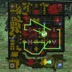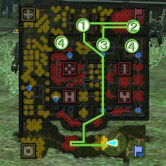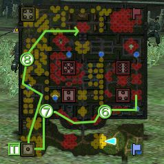 <1>①へ向かいながら強化をします。 <2>①にいる周偉(偽者)を撃破します。 <3>②に到着すると課題が出されますが、副将によって課題が異なります。 ・護衛副将の場合は副将強化3段階と連撃強化3段階。 ・騎乗副将の場合は連撃強化3段階と200人撃破。 <4>課題をクリアすると、②に雨幻(SA)が出現するので撃破します。 <5>③に到着すると④の泉周り2箇所の赤兵士を殲滅する課題が出されます。 <6>課題をクリアすると、③に霧幻(SA)が出現するので撃破します。 <7>⑤に到着すると中央の4拠点を5、6、2、3の順で回る課題が出されます。(6番拠点通過後に壁を1つ破壊有り) <8>課題をクリアすると、⑥に曇幻(SA)が出現するので撃破します。 <9>⑦に到着すると、1番拠点(兵長)の制圧と付近の黄色兵士殲滅(櫓上の弓兵も対象)の課題が出されます。 <10>課題をクリアすると、⑦の少し上に雪幻(SA)が出現するので撃破します。 <11>⑧を通過して本物の周偉を救出します。 <12>①にいる妖術使い(SA)を撃破します。