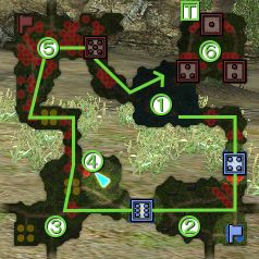 <1>①に出現した仙人を撃破します。(①までは時計回り、反時計回りどちらのルートでも構いません) <2>②、③に仙人が出現するので撃破する。 <3>④に仙人が出現するので撃破する。(北東にも仙人が出現しますが無視します) <3>⑤に仙人が出現するので撃破する。 <4>⑥に本物の仙人が出現するので撃破する。 <5>クリアした時間が早ければ達成度S。 <*>①の仙人接触前に操られた兵士と出会いますが、撃破してしまうと特務失敗になります。 <*>1番拠点(兵長)を制圧すると獲得義が1から4に増えます。 <*>次々と出現する仙人を撃破する順番を間違えると、倒さなければならない仙人が増えてしまいます。