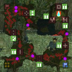 *紫色の丸は7人の武将の位置です。 <1>1、2、3番拠点(全て兵長)の1つを制圧する。 <2>制圧すると、ランダムで特務内容が3種類に分岐する。 ・500人撃破する。(配置されている兵士の数が減少します) ・拠点を全て制圧する。 ・7人の武将を撃破する。 <3>クリアした時間が早ければ達成度S。