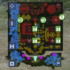 *紫色の丸は2本の木の中央地点です。 <1>課題をこなしつつ、特務を達成するまでに500人撃破する。 <2>『泉に群がる赤と黄 2つが消えれば青が咲く……』と課題が出されるので、①、②の泉周辺の兵士を殲滅する。 <3>③にある塔に近付くと手紙を手に入れるので、凛凛の元へ行きます。 <4>『川沿いの2木 この間を裂く者は解放を得る……』と課題が出されるので、紫色の丸の場所に5秒間留まり、『鉄でできた棒状のもの』を発見する。 どの場所にあるかはランダムになります。 手紙を渡してから約1分以内に発見し、凛凛から『すごい! あなた千里眼でも持っているの?』とメッセージを貰うことが達成度S取得の条件の1つになります。 <5>凛凛の元へ行きます。 <6>『固まる4つの点 いずれかを選択せん……』と課題が出されるので、3、4、7、8番拠点のいずれかに入り、遺品を発見します。 課題を出されてから約1分以内に発見し、凛凛から『すごい! あなたの速さは超人的だわ!』とメッセージを貰うことが達成度S取得の条件の1つになります。 <7>500人撃破を達成したら凛凛の元へ行きます。 <*>拠点を1つ制圧すると獲得義が1から4に増えます。 <*>2本の木の間に留まる課題を1分以内に達成するのは難しいので、移動速度の速い武器や、ランスロの移動最大、騎乗副将のランスロ、究極効果『神速』などを活用しましょう。