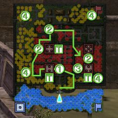 <1>①にいる弟子・一(SA)を撃破する。 <2>②のどこかに弟子・二(SA)が出現しているので、撃破する。(②付近の高台に登ることで発見出来る) <3>弟子・二を探す際に2番拠点(兵長)、4番拠点(兵長)を制圧しておく。 <4>弟子・三がどこかの拠点に隠れているとメッセージが出るので、3番拠点(兵長)を制圧する。 <5>③に弟子・三(SA)が出現するので撃破する。 <6>④のどの位置に本物の幻術士(SA)がいるか分かるので、壁を破壊して撃破する。 <7>クリアした時間が早ければ達成度S。 <*>弟子を全員撃破せずに幻術士を倒しても達成度Sは取得出来ません。 <*>2、4、3番拠点の順に制圧することで、弟子・三は3番拠点制圧で確実に出現すると思われます。