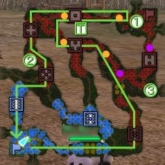 *紫色の丸は使者・一の移動ルート(ワープ)です。 *橙色の丸は使者・二の移動ルート(ワープ)です。 <1>7番拠点を通過する。(敵拠点進入1回目) <2>使者・一を撃破する。 <3>3番拠点を通過する。(敵拠点進入2回目) <4>使者・二を撃破する。 <5>①に首領が出現する。 <6>1番拠点(兵長)を制圧する。(敵拠点進入3回目) <7>①の首領を撃破する。 <8>4番拠点を通過する。(敵拠点進入4回目) <9>首領撃破から約1分後、②に窃盗団長が出現するので撃破する。 <10>5番拠点を通過する。(敵拠点進入5回目) <11>味方兵糧庫に入る。 <*>首領撃破から約3分後、③に山賊大将が出現します。出現した場合は、撃破しなければ達成度Sを取得出来ません。 <*>首領撃破直後に撤退して7番拠点で復活すれば、窃盗団長出現前に味方兵糧庫に到着することも可能です。 <*>達成度Sの条件は使者・一、二を撃破、敵拠点進入5回以下、窃盗団長と山賊大将が出現したら撃破になります。