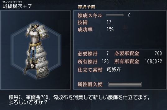 仕立て 各種錬成機から服飾の『仕立て』を行うことが出来ます。 仕立てのコスト 『仕立て』を行うためには、仕立て可能な服飾・素材・錬丹が必要です。