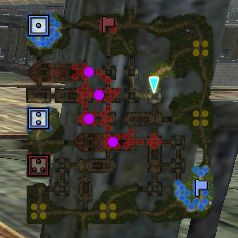 *紫色の丸はごろつき1~4です。 <1>強化をせずにごろつき1~4(SA)の誰かを撃破する。(制限時間+5分) <2>ごろつきを1人を撃破すると、残りのごろつきのSAがなくなるので撃破する。 <*>この特務中は常に天候が大雨になります。 <*>強化を一度でもすると達成度Sが取得出来なくなるようです。 <*>ごろつきは非常に堅いので、斬玉で攻撃するか、白虎牙を付けて2倍地上無双で撃破するのがオススメです。