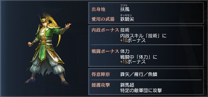 「錦馬超」の異名を持つ。感情豊かで情熱的な若武者で、