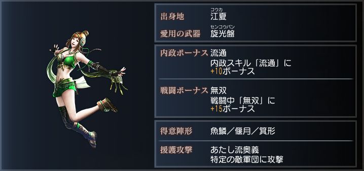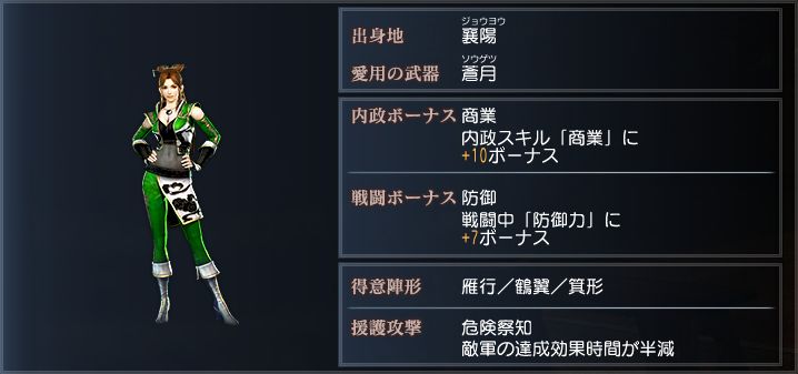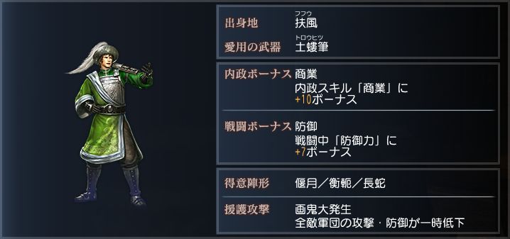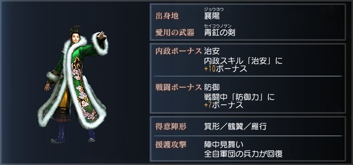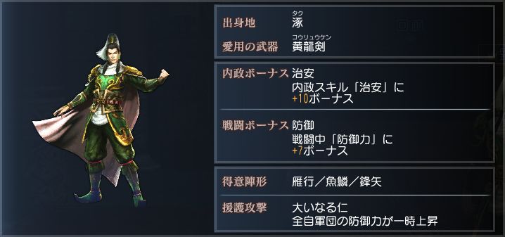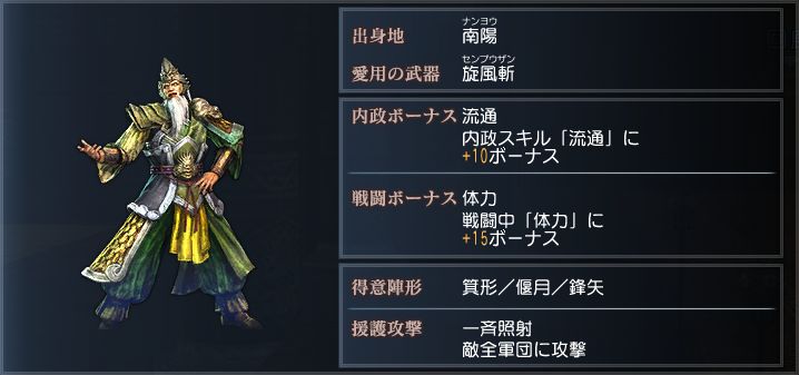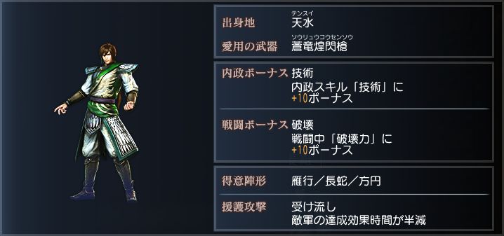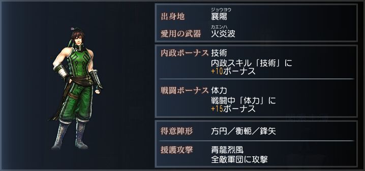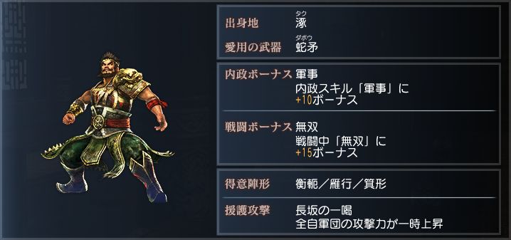 後に、蜀の五虎大将に数えられる。性格は穏やかだが、