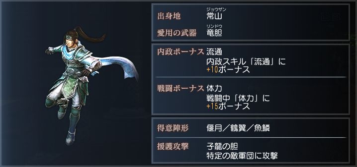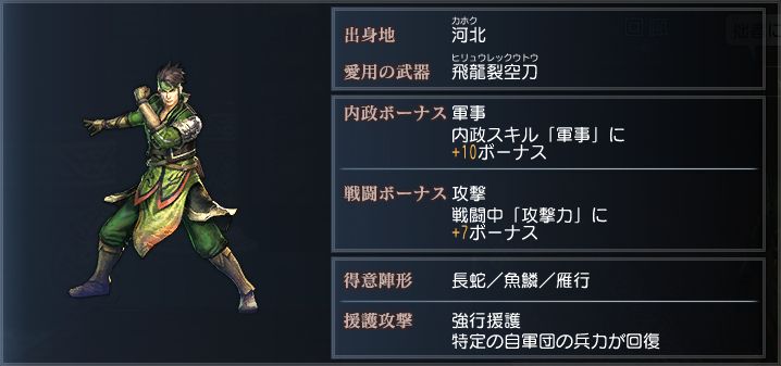 憧憬から、劉備の軍に参じて後、瞬く間に武芸の腕を高めた。