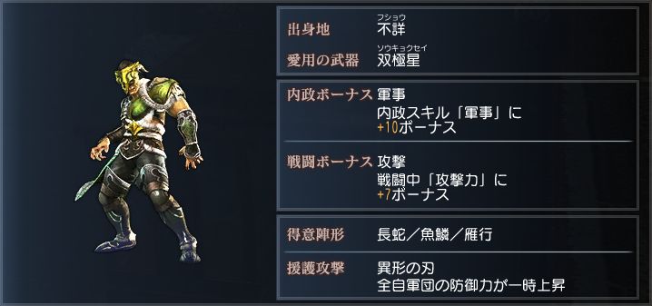 その強さ、風貌、言行により、敵味方問わず恐れられる。